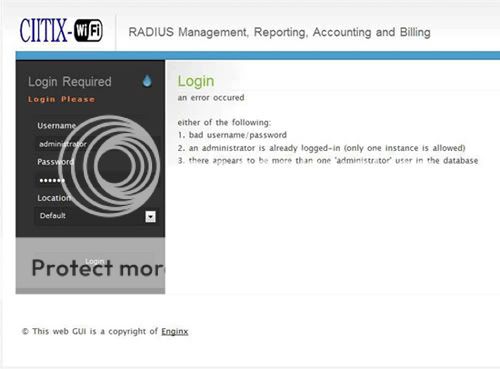 - Trang đăng nhập hiển thị, mặc định tài khoản quản trị với tên đăng nhập administrator, mật khẩu radius. Nếu các thao tác bên trên không chuẩn xác thì bạn sẽ gặp thông báo lỗi sau: