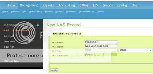 Management > NAS > new NAS, điền địa chỉ IP của thiết bị access point hoặc router (ở đây là