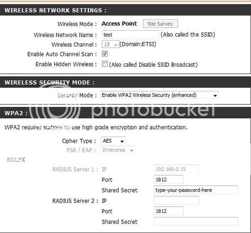 - Ảnh chụp màn hình dưới đây được lấy từ thiết bị access point D-Link DAP-1150. Quá trình cấu hình như với bình thường, các bạn chỉ cần chú ý đến tính năng sử dụng WPA hoặc WPA2 enterprise và chỉ định radius server rõ ràng. Thông số radius server IP là địa chỉ IP của CIITIX-WiFi server, địa chỉ cổng mặc định là 1812: