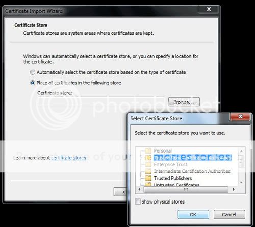 Open > install certificate > next > place all in following store > browse > trusted root certification > ok > next > finish như hình sau: