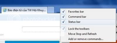 Để khôi phục lại các thanh công cụ này, giúp thuận tiện trong việc sử dụng, bạn kích chuột phải vào khu vực trống nằm gần tab đang được mở trên IE, đánh dấu vào các thanh công cụ (bar) mà bạn muốn hiển thị.