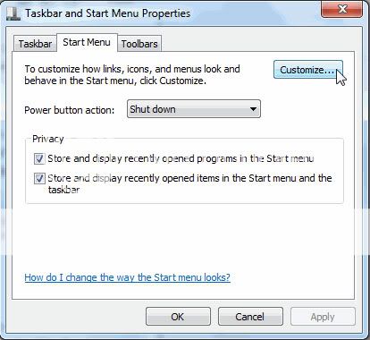 2. Khi màn hình Taskbar and Start Menu Properties xuất hiện. Bên dưới tab Start menu, kích nút “Customize”.