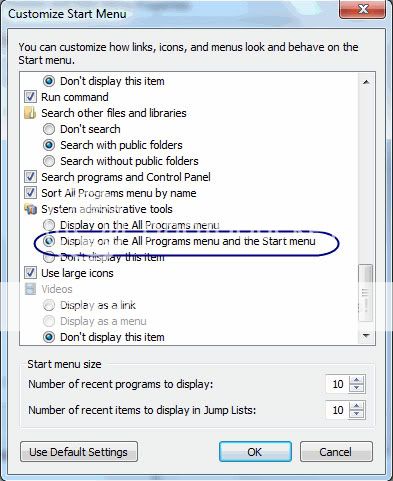 3. Cuộn xuống và tìm đến phần “System administrative tools”. Ở đây có ba tùy chọn, tuy nhiên bạn hãy chọn tùy chọn “Display on the All Programs menu and the Start menu”.